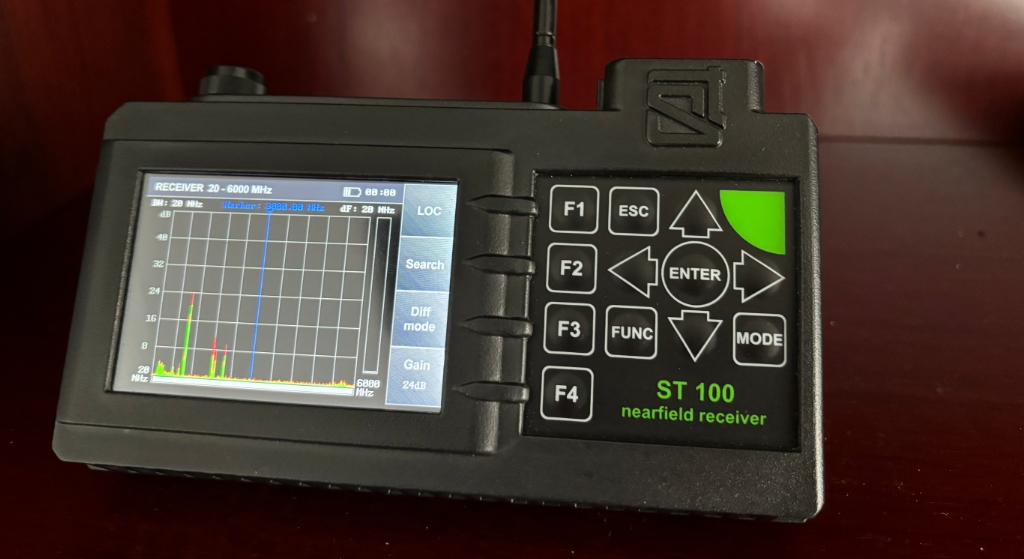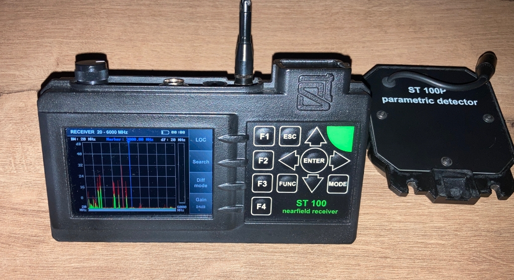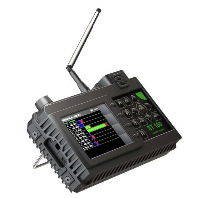 ST-100 is a transceiver device that detects the modulation of the reflected RF sounding signal caused by low-frequency processes in working electronic devices.