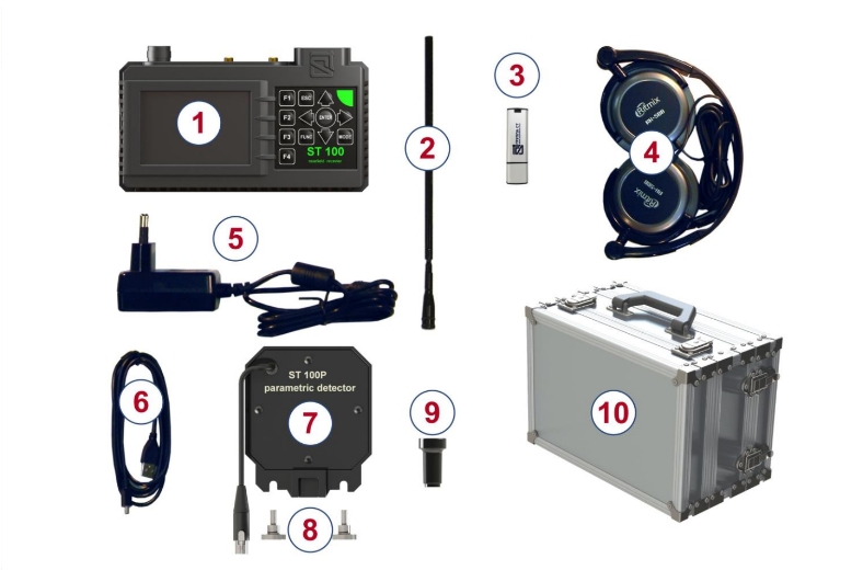 Device, antenna, USB, Headphones, charger, usb cable, Parametric detector ST 100, antennas, rugged case.